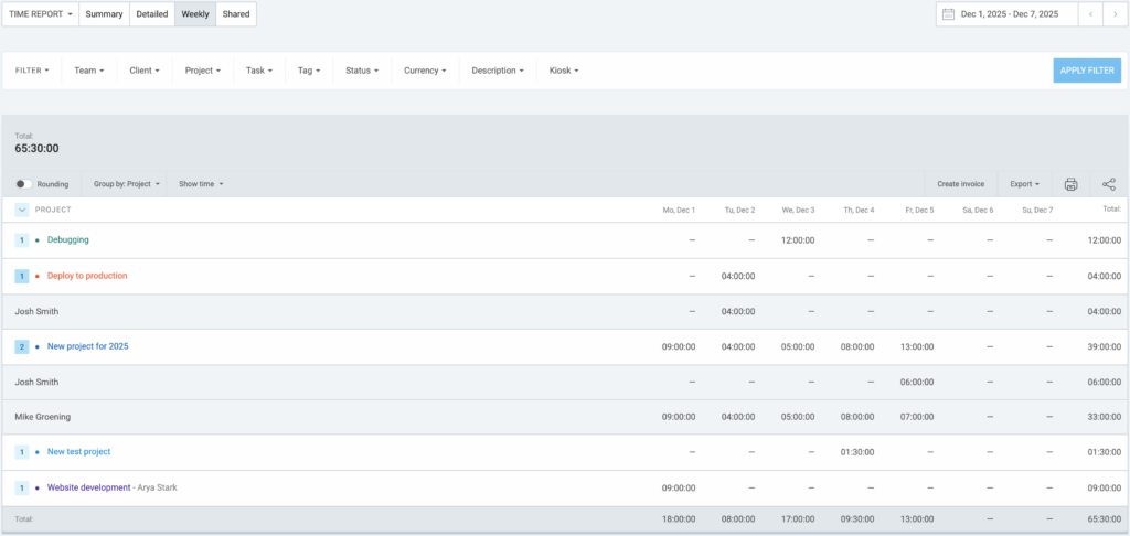 Like in any other time report, you can use filter data, change time range, share report, create invoice from report and print/export the results.