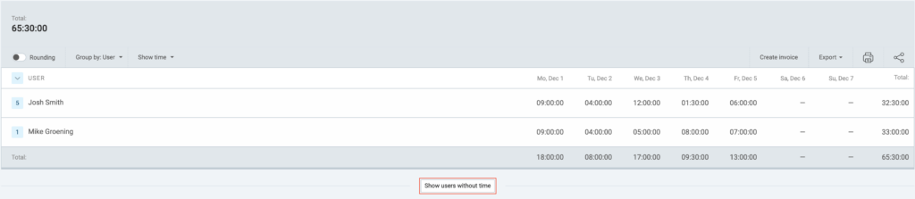 To see who hasn’t tracked any time in a given week, group the report by user and click on Show users without time. Owners, Admins and Team managers can see this option.