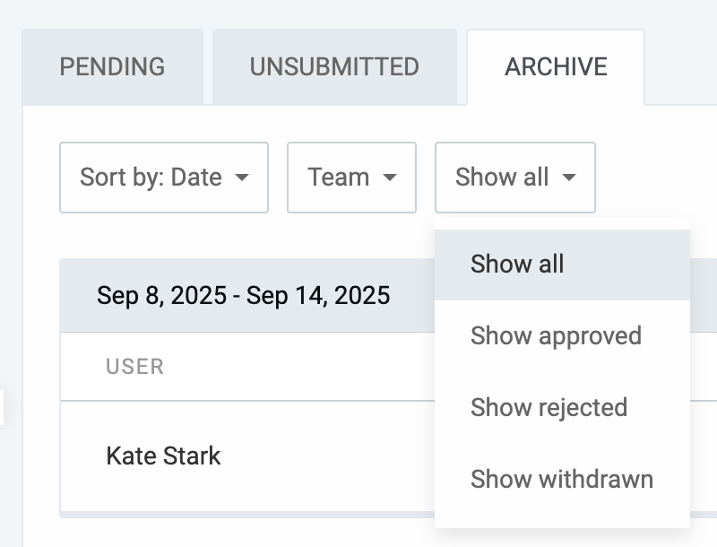 - The Archive will display all previously submitted timesheets with that status