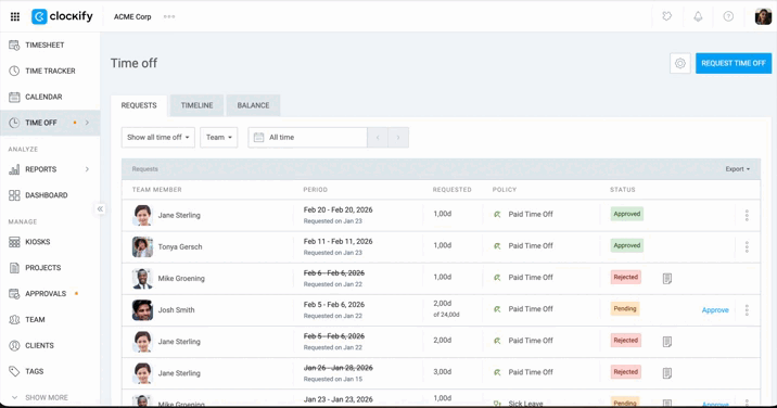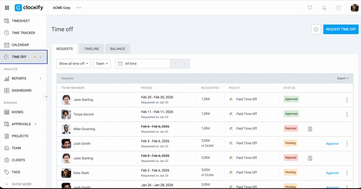 Approve, reject, and track your team’s time off requests in the Time Off page.