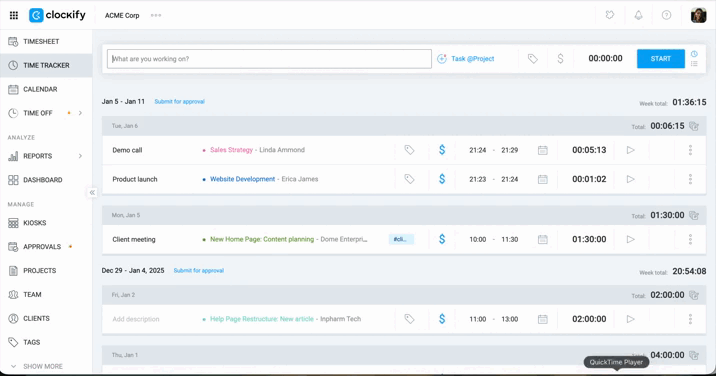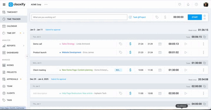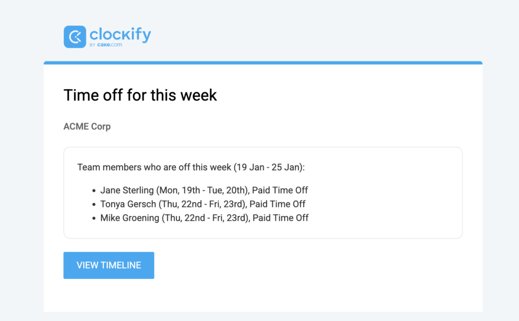 *Clockify sends a weekly email notification listing all approved time off for their team members in the upcoming week.