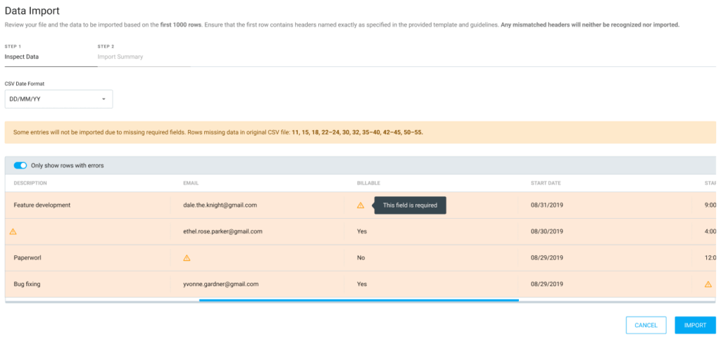 Clockify automatically detects common delimiters (commas and semicolons). If a column name is not recognized, it will be marked with a warning and that data won’t be imported.