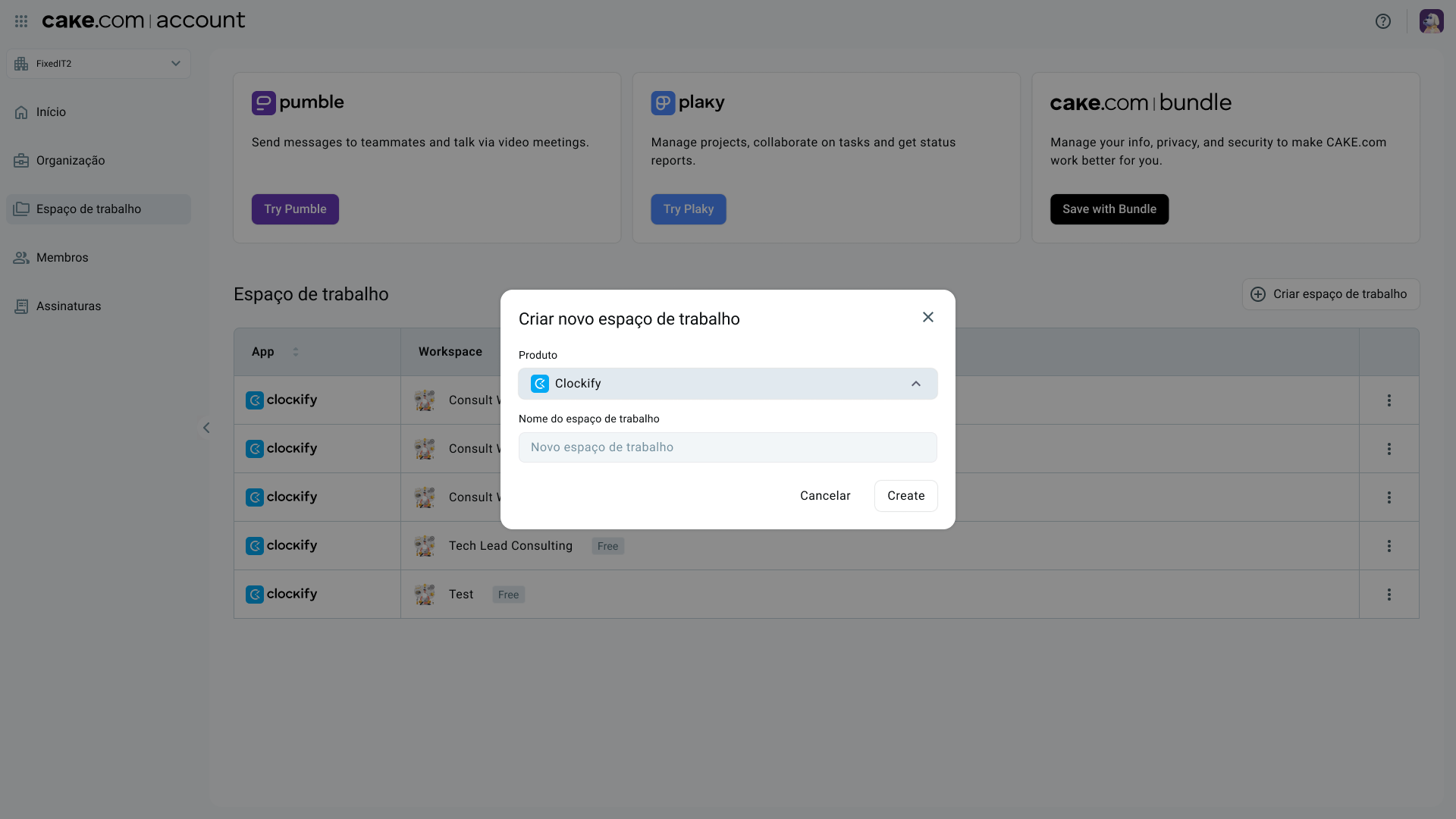 Você será redirecionado para sua conta CAKE.com e para a página de Espaços de trabalho. Agora, você verá um botão "Criar espaço de trabalho", onde poderá criar um novo. Selecione Clockify como produto e digite o nome de um espaço de trabalho.